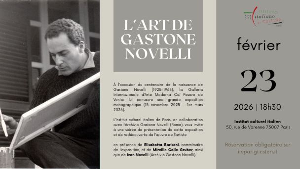 Il 23 febbraio 2026, alle ore 18:30, l’Istituto Italiano di Cultura di Parigi, in collaborazione con l’Archivio Gastone Novelli, dedica un incontro a Gastone Novelli. Sarà innanzitutto l’occasione per presentare la mostra organizzata a Venezia per il centenario della sua nascita, con Elisabetta Barisoni, co-curatrice della mostra e direttrice di Ca' Pesaro - Galleria Internazionale d'Arte Moderna. Ma per il pubblico parigino sarà anche possibile approfondire i rapporti di amicizia e collaborazione tra Novelli e il premio Nobel per la letteratura Claude Simon, su cui interverrà Mireille Calle-Gruber, professoressa all’Università Sorbonne-Nouvelle.
